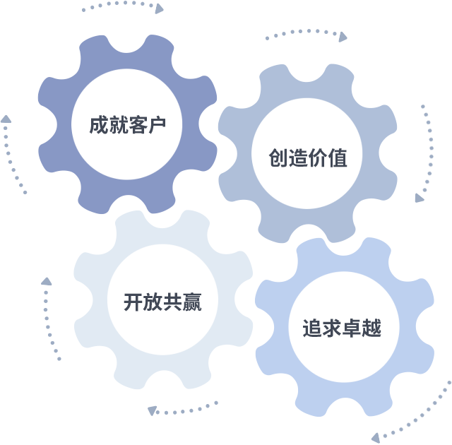 成就客户是一切决策的出发点,,创造价值是衡量所有工作的标准,,,,追求卓越是我们做事做人的态度,,开放共赢是我们的格局也是最终的结果。。。价值观的齿轮环环相扣,,,推动着组织里的每个人不断向前。。
